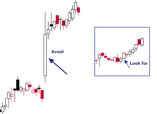 I wouldn't necessarily "avoid" longest candles, as they can be very important candles depending on where they are in relation to the trend. Long candles Down are better approaching bottoms, often indicating climactic selling action. Long candles Down coming off tops are definitely worrisome as they often change the trend or stage. The same is true for long candles Up. Off of bottoming areas, they are more likely to be a sign of strength and long candles Up near tops are often climactic buying and prone to pullback or reversals. All of this is just my opinion.0 -